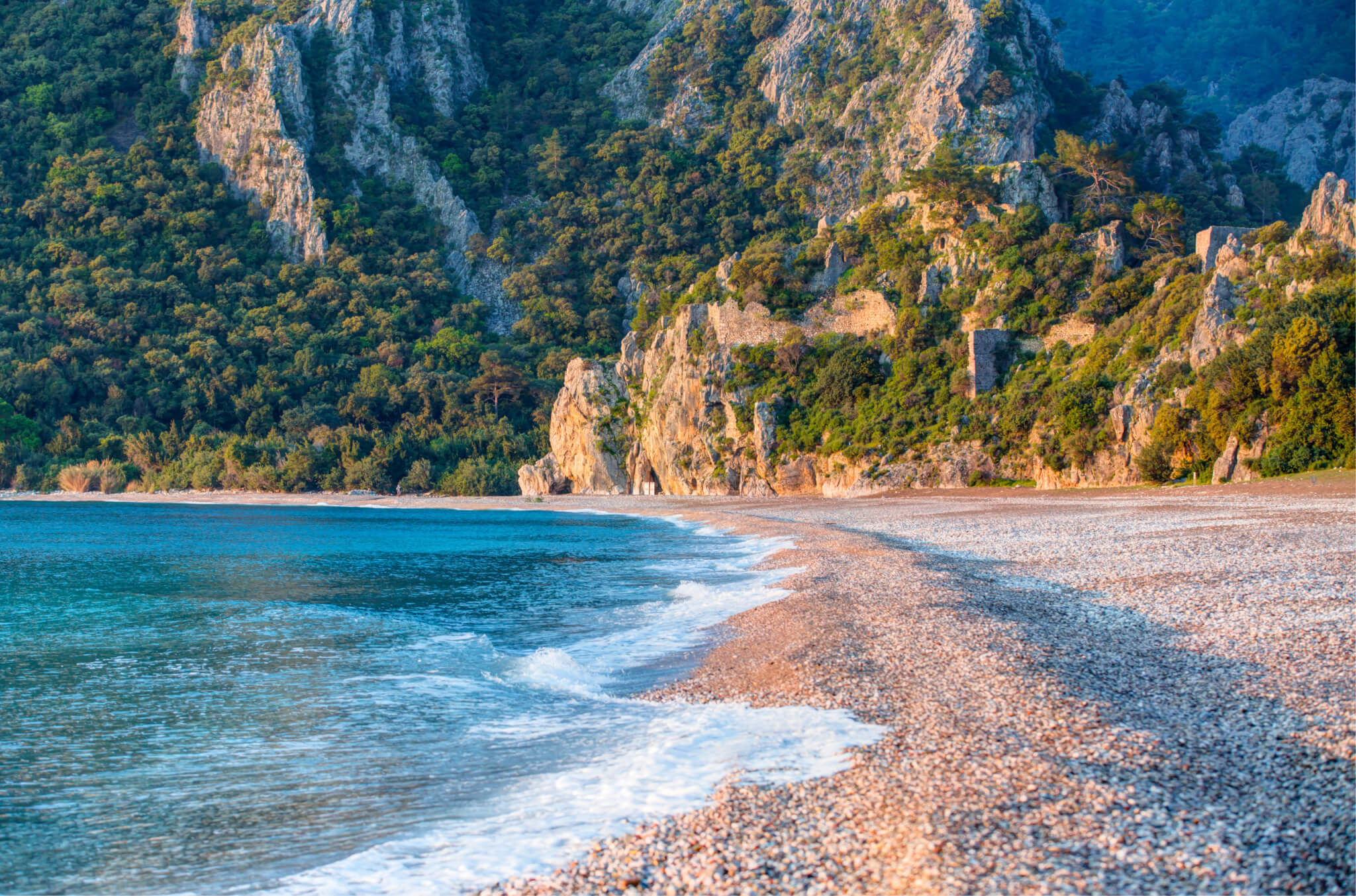 Von der einst bedeutenden Stadt des Lykischen Bundes sind nur noch wenige Ruinen erhalten geblieben. Der Spaziergang vom goldgelben Olympos Beach zu den antiken Überresten ist bereits ein kleines Abenteuer: Der Weg führt entlang des Flusses Akça Çay durch ein schmales Tal, flankiert von bewaldeten Mauerresten, die die ehemalige Handelsstadt umgeben. Dieses Erlebnis verbindet Naturerlebnis mit kultureller Entdeckung – typisch für einen nachhaltigen Urlaub in Çıralı Türkei.